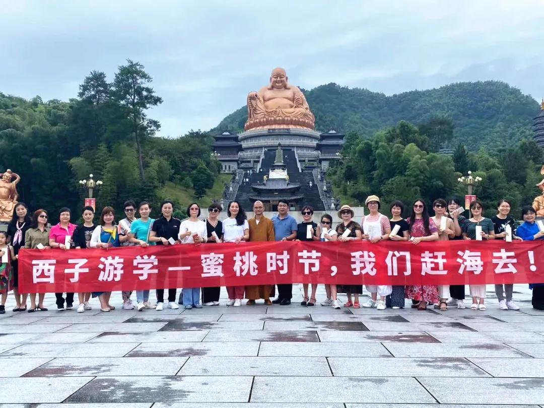7月中旬,奉化的水蜜桃便进入了最好吃的季节。7月25日-26日,踩着蜜桃成熟的时间点,西子会应促进会秘书长联谊会会长江炳其的热情邀约,由副会长陈妩、秘书长许敏慧、陈志芳带队一行近40人相约宁波,观雪窦寺,游翡翠湾。